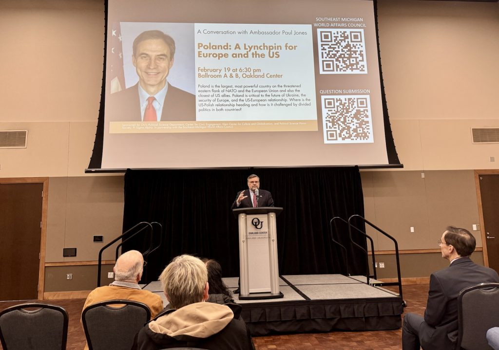 “Poland: a Lynchpin for Europe and the US” was the title of a talk given by Paul Jones, former Ambassador to Poland, on Thursday, February 19 at Oakland University.