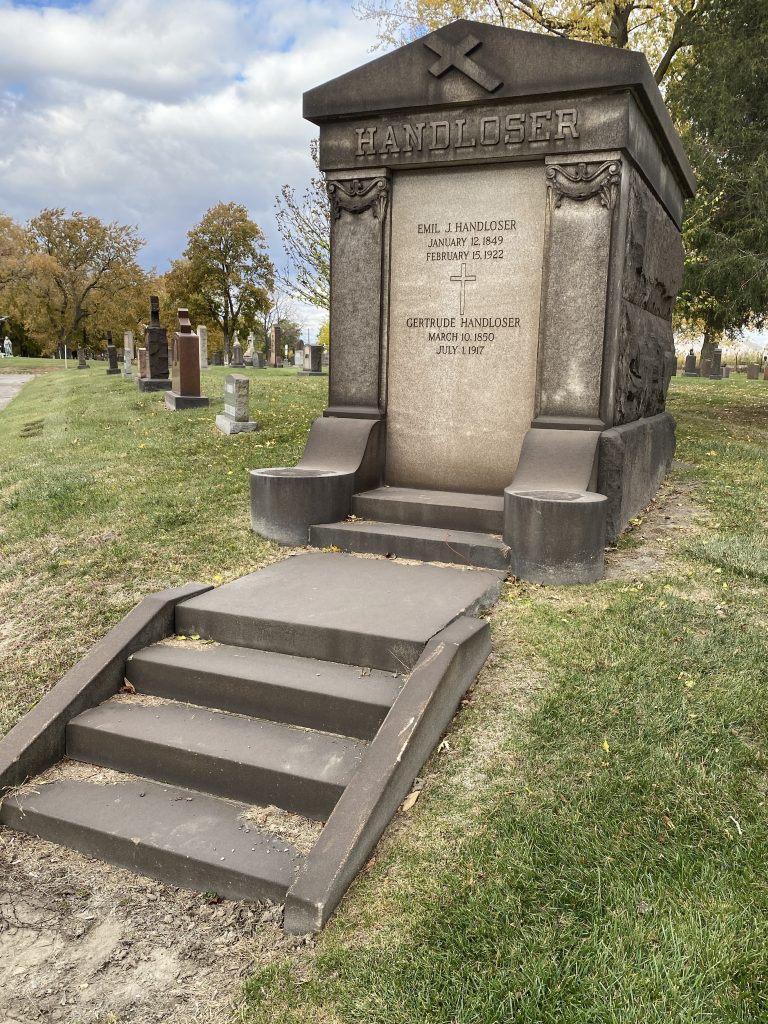 In keeping with its humble origins, the funerary architecture of Holy Cross lacks the grandeur notable in other large Detroit cemeteries, whether they be Catholic or non-Catholic. The presence of the surrounding slag heaps makes the cemetery feel like a quiet, green sanctuary for those who have gone before. Holy Cross’s one small mausoleum is very spartan in design with a simple marble door protecting the occupants, Emil and Gertrude Handloser.